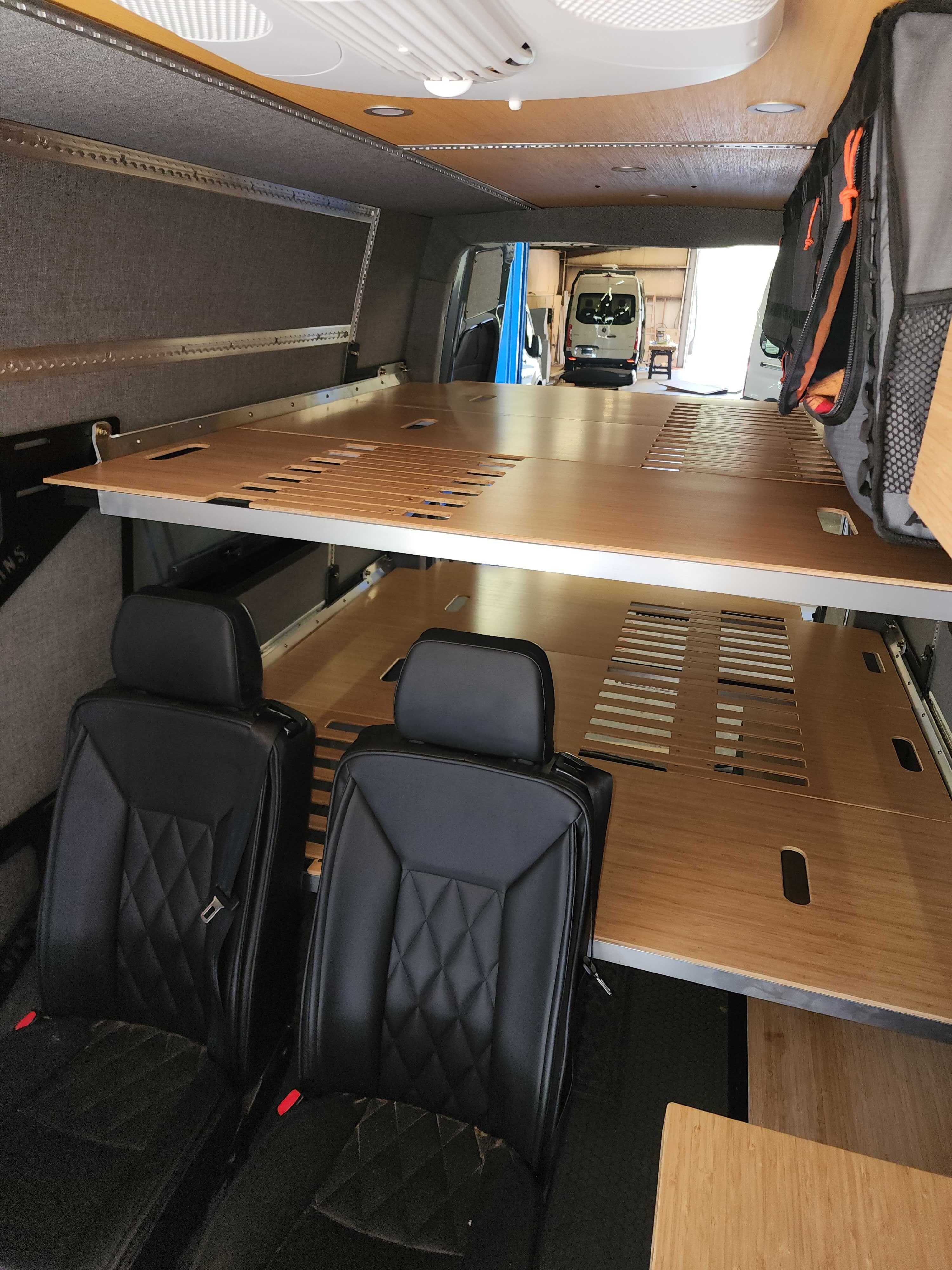 Built to work with Adventure Wagon’s innovative and ultra-functional Modular Interior Wall Kit, the MOAB bed system can be easily installed on the vertical L-track mounting system. This practical and easy installation system also means that you can adjust the bed in height from just 10.5”, to 67.5” off the floor of your van. Adhering to Adventure Wagon’s mission of giving you components that adapt for where you adventure van may take you next, this gives you ultra-versatile options for both sleeping arrangements and storage. It means you can set up two beds, low and high, for multiple sleepers or families, or create flexible storage solutions like raising the bed to store bikes or bulkier gear underneath.